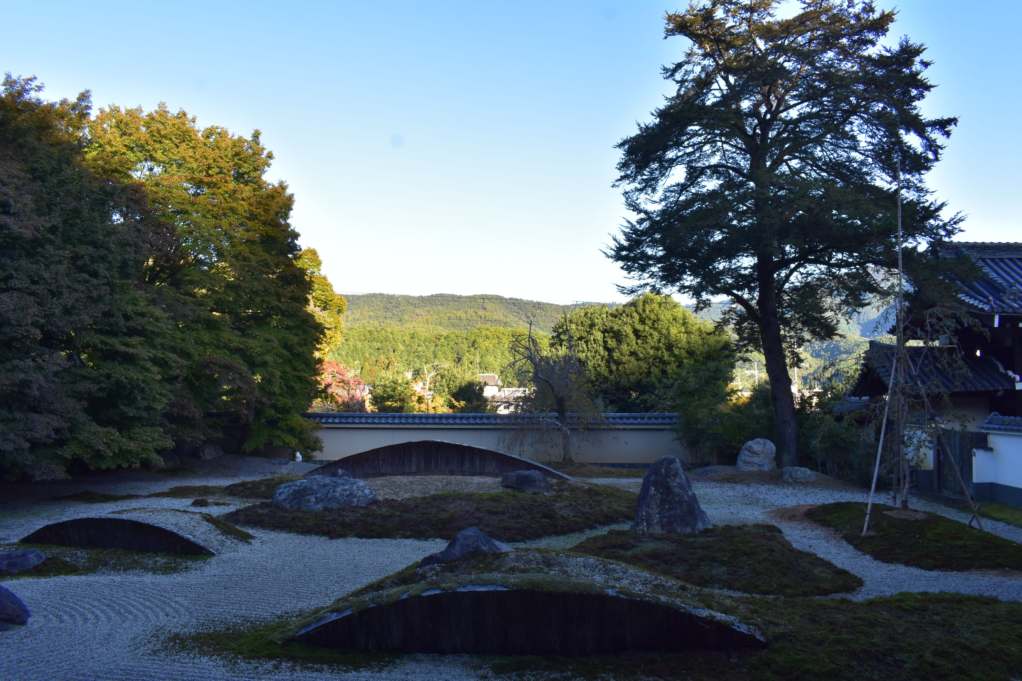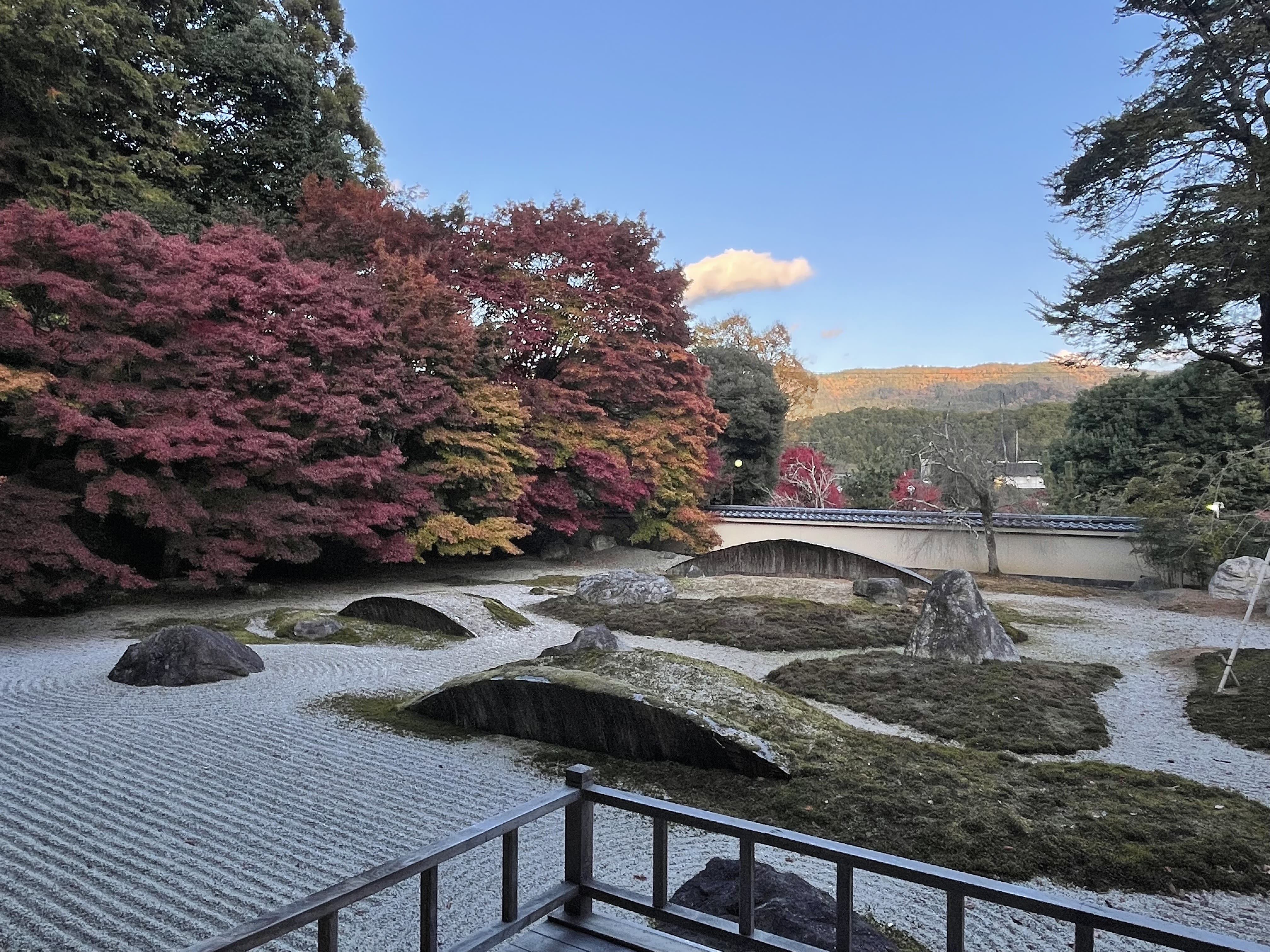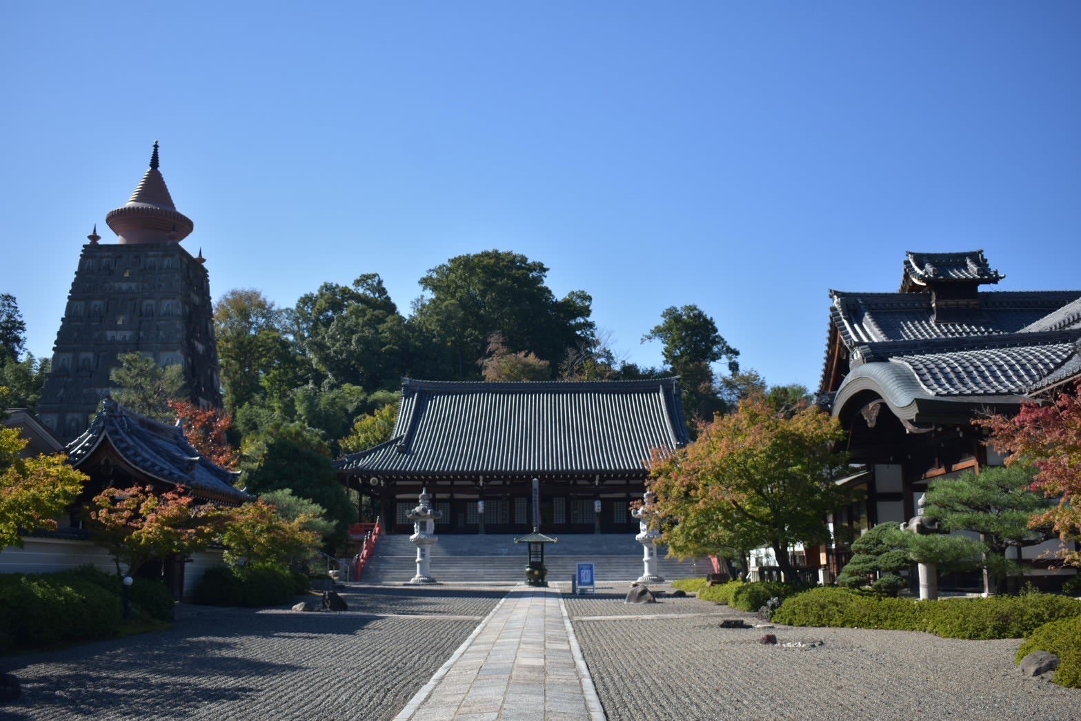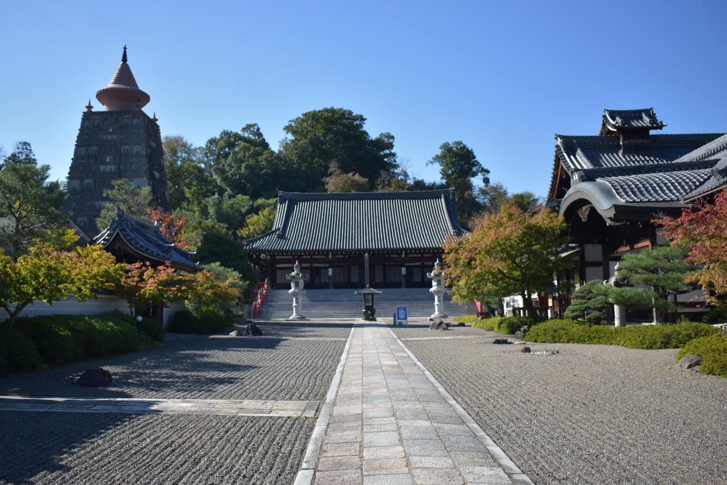 康応元年(1389年)に寺町二条に創建された妙満寺は、その後火事にあいながら昭和43年(1968年)に洛北・岩倉へ移転し、現在の場所にできた。正面から入り境内を上ると、比叡の山並みが見られる。本坊には、能や歌舞伎の演目で知られる『娘道成寺』由来の「安珍清姫の鐘」など多数の寺宝を見学することができる。